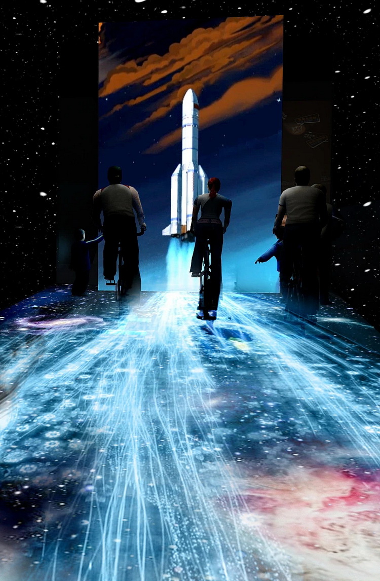 地面互动投影采用悬挂在顶部的投影设备把影像效果投射到地面,当参访者走至投影区域时,通过系统识别,参访者可以直接使用双脚或动作与投影幕上的虚拟场景进行交互,互动效果就会随着你的脚步产生相应的变幻。