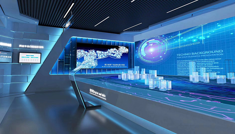 多媒体数字沙盘通过墙面或者地面大面积LED播放系统、大面积投影拼接系统,结合GIS城市地理信息系统海量数字城市模型数据,应用专利的软件、硬件、数据整合系统,配合使用,触摸控制屏、三维控制器、IPAD等多种互动控制平台,实现海量数字城市信息查询。墙面数字沙盘系统配合地面三维立体真实模型呈现虚拟与真实、多角度、全方位的数字城市信息。